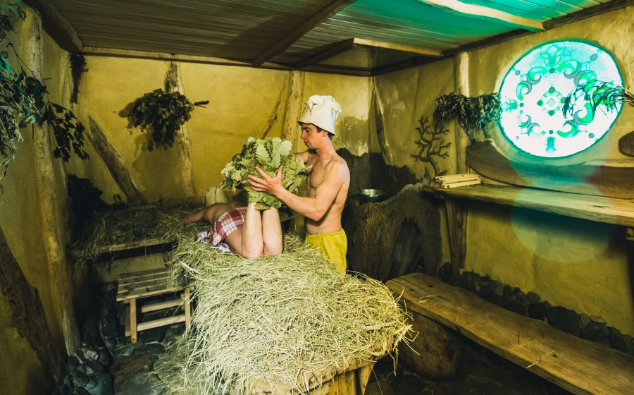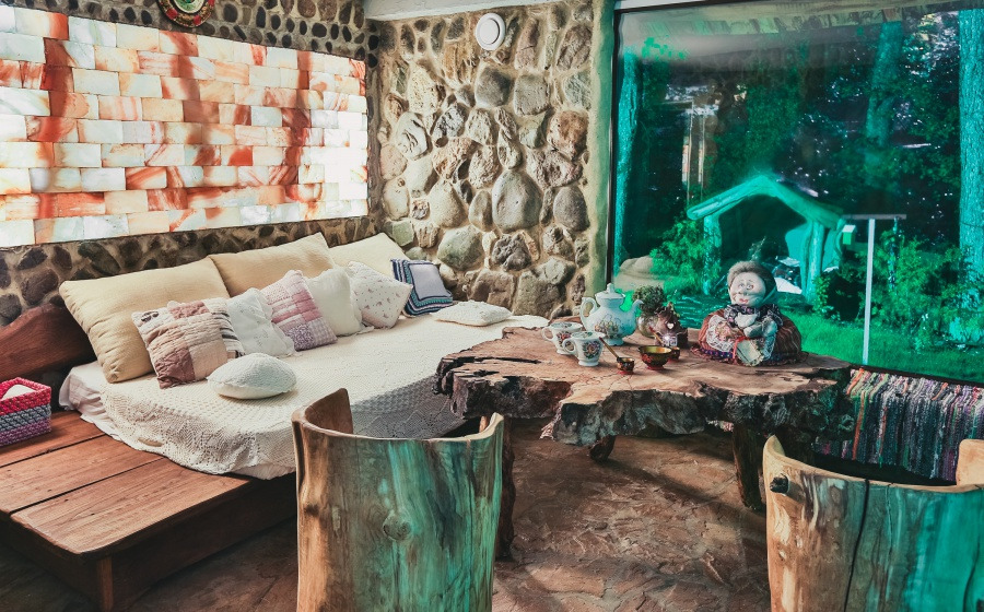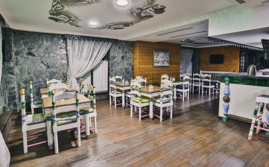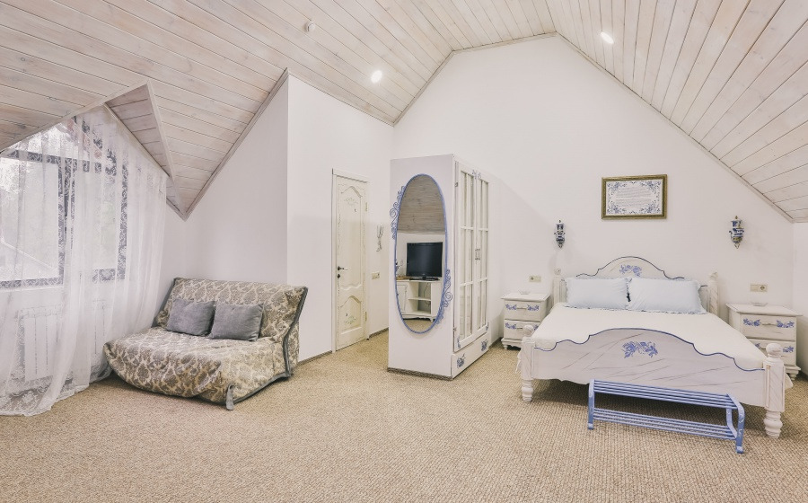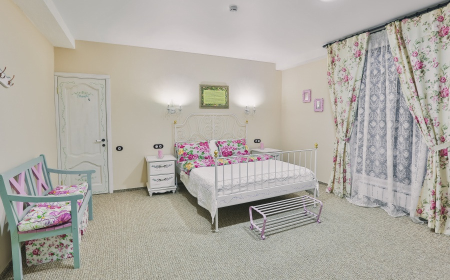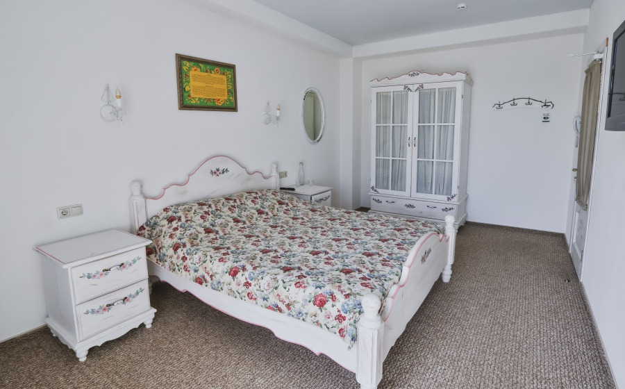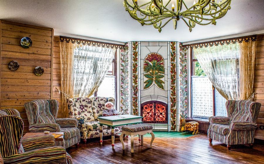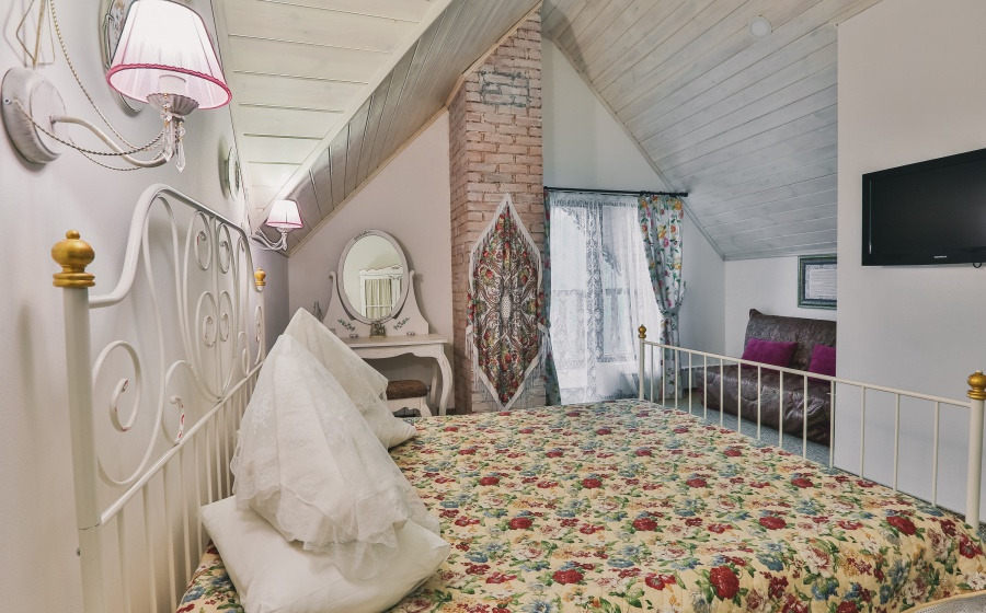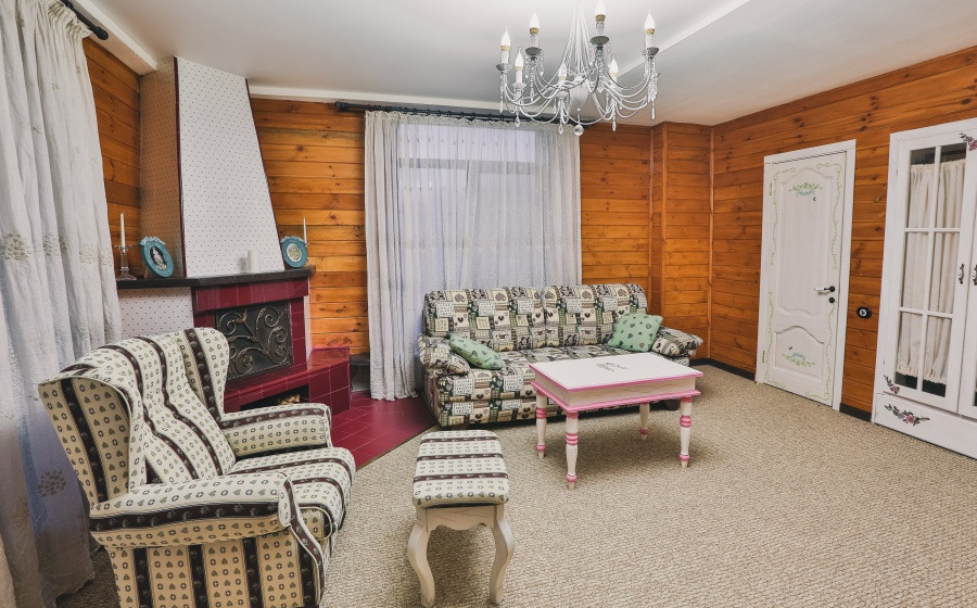 Отель построен в стиле русского купеческого дома 19 века, отделан деревом и украшен резными ветровыми досками. Каждый номер оформлен в своем стиле и имеет соответствующее название: «Гжель», «Хохлома», «Палех», «Жестов», «Финифть», «Городец», «Терем» и другие.