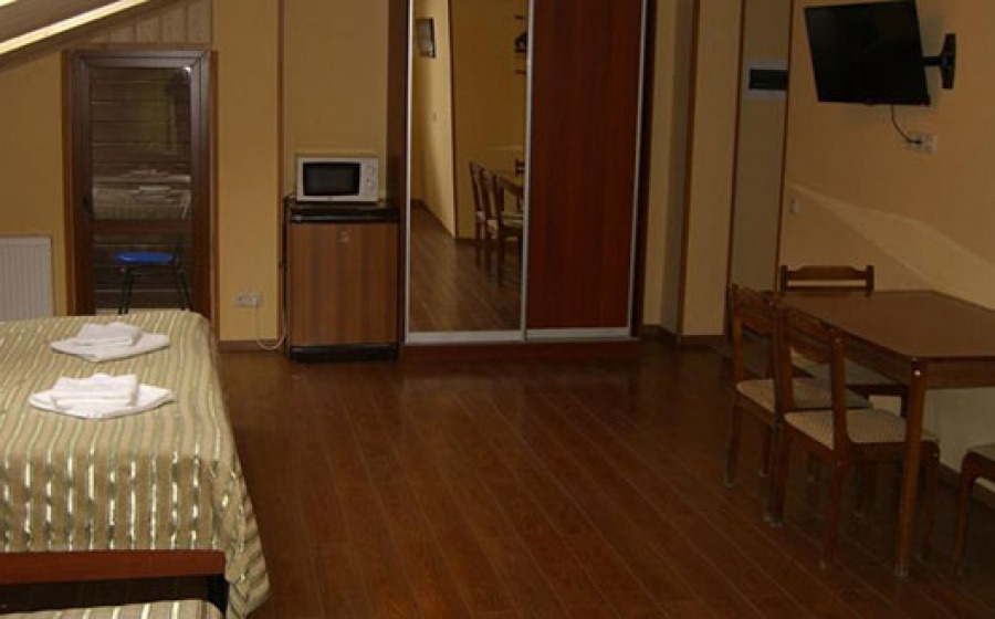 Люкс: холл, две спальни (в каждой спальне имеется большая французская кровать), телевизор, одна небольшая комната с двухъярусной кроватью, два санузла. В номере люкс возможно размещение до 6 человек.