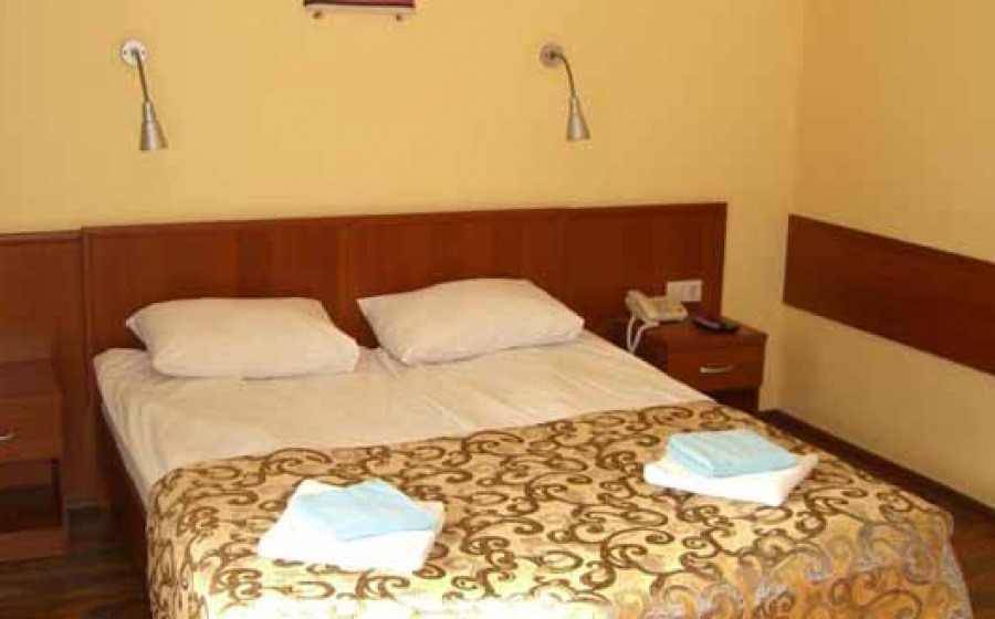 Номер Стандарт: однокомнатный номер с большой французской кроватью, раскладной диван (дополнительное место), телевизор, душ, туалет.