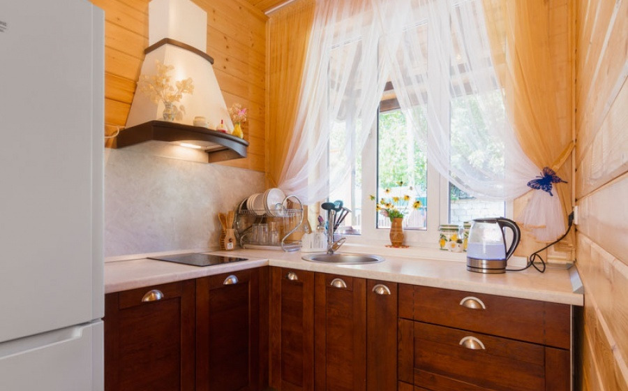 В доме на 6-8 человек на первом этаже располагается одна уютная спальня, санузел и зал совмещенный с полностью оснащенной кухней. На втором этаже располагаются две спальни с санузлами.