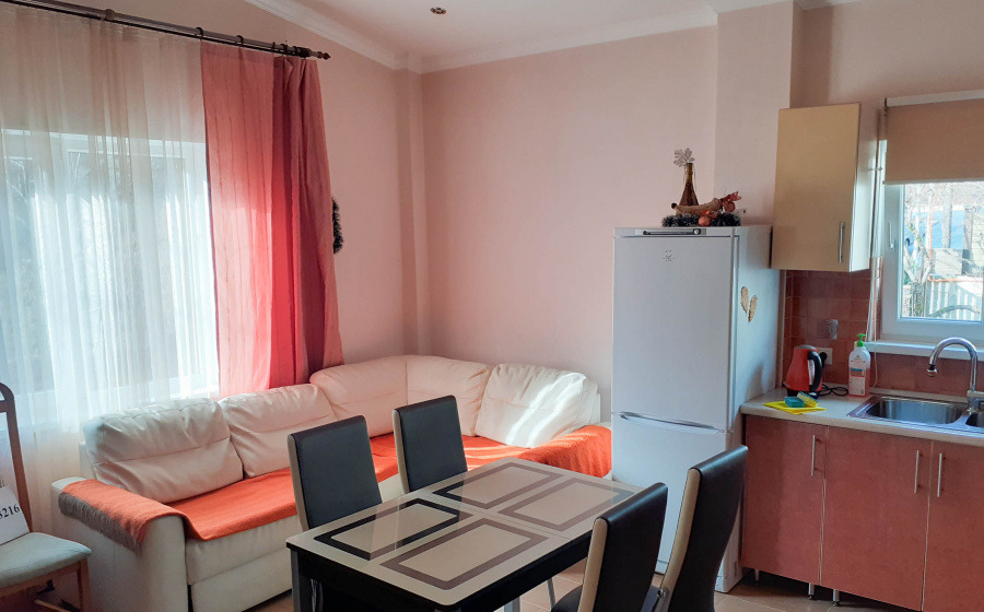 В доме есть две небольшие спальные комнаты с двухспальными кроватями, гостиная с кухней, ванная комната с ванной, прихожая, просторный балкон, беспроводной интернет, триколор ТВ.