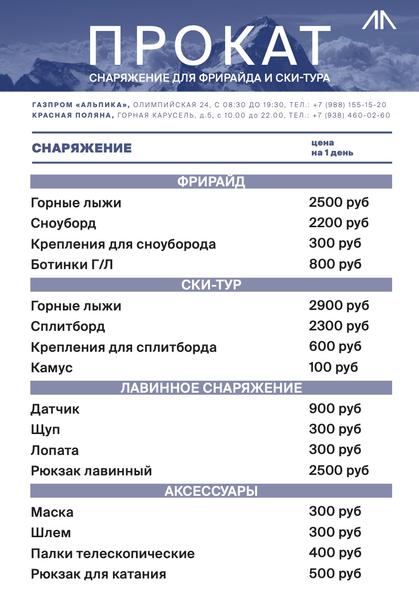 Все самое необходимое снаряжения для безопасного и комфортного катания вне подготовленных трасс. Горные лыжи и сноуборды, комплекты для ски-тура, а также лавинное снаряжение от лучших мировых брендов. Ежегодно большая часть прокатного пула обновляется в соответствии с витриной представленных на российском рынке горных лыж для фрирайда, это дает вам возможность не только арендовать хорошее снаряжения, но и протестировать его перед приобретением.