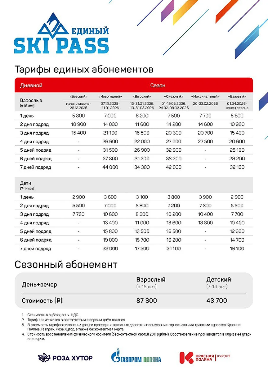 Тарифы на спортивные билеты (ски-пассы) Центрального и Восточного сектора курорта